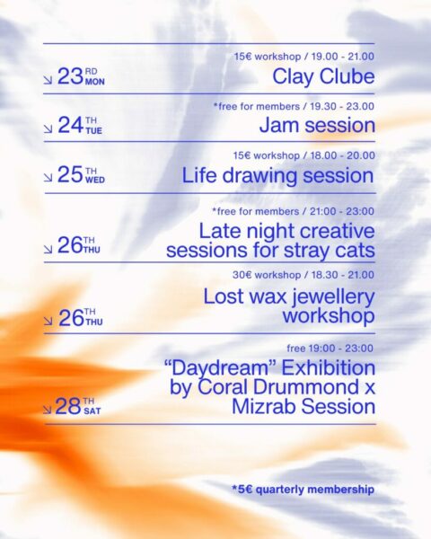 | 28/03/26 | SAT | 19:00 – 23:00 | “Daydream” – Exhibition by Coral Drummond x Mizrab Session | Art&Music | Free |