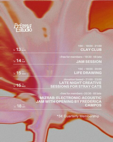 | 13/04/26 | MON | 19:00 – 21:00 | Clay Club | Workshop | 15€ |
