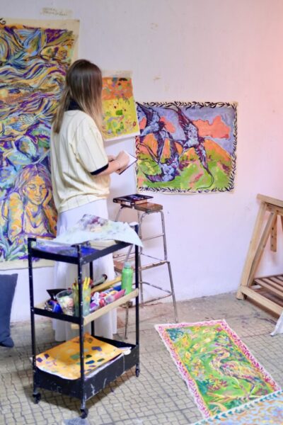 Based in Berlin, Em Vai explores the human form through vibrant acrylic paintings. During the residency, she delves into the concept of ‘self’ as understood in Karelian mythology, which comprises henki/breath, luonto/nature, and itse/self. In today’s interconnected digital era, Em Vai fosters reflection on the evolving relationship with collective and individual heritage.